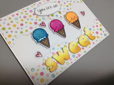 Now I didn't want to use enamel dots or sequins. I should have because they are removable. So, instead I chose the Lots of Dots stamp set from Simon Says Stamp (love this set!) I stamped the top three by the sentiment first...good. Then thought the bottom right looked too bare. Stamped three there as well. Aaaand, not a fan. Looking it at it now, I really don't mind it but at the time I just didn't like it.