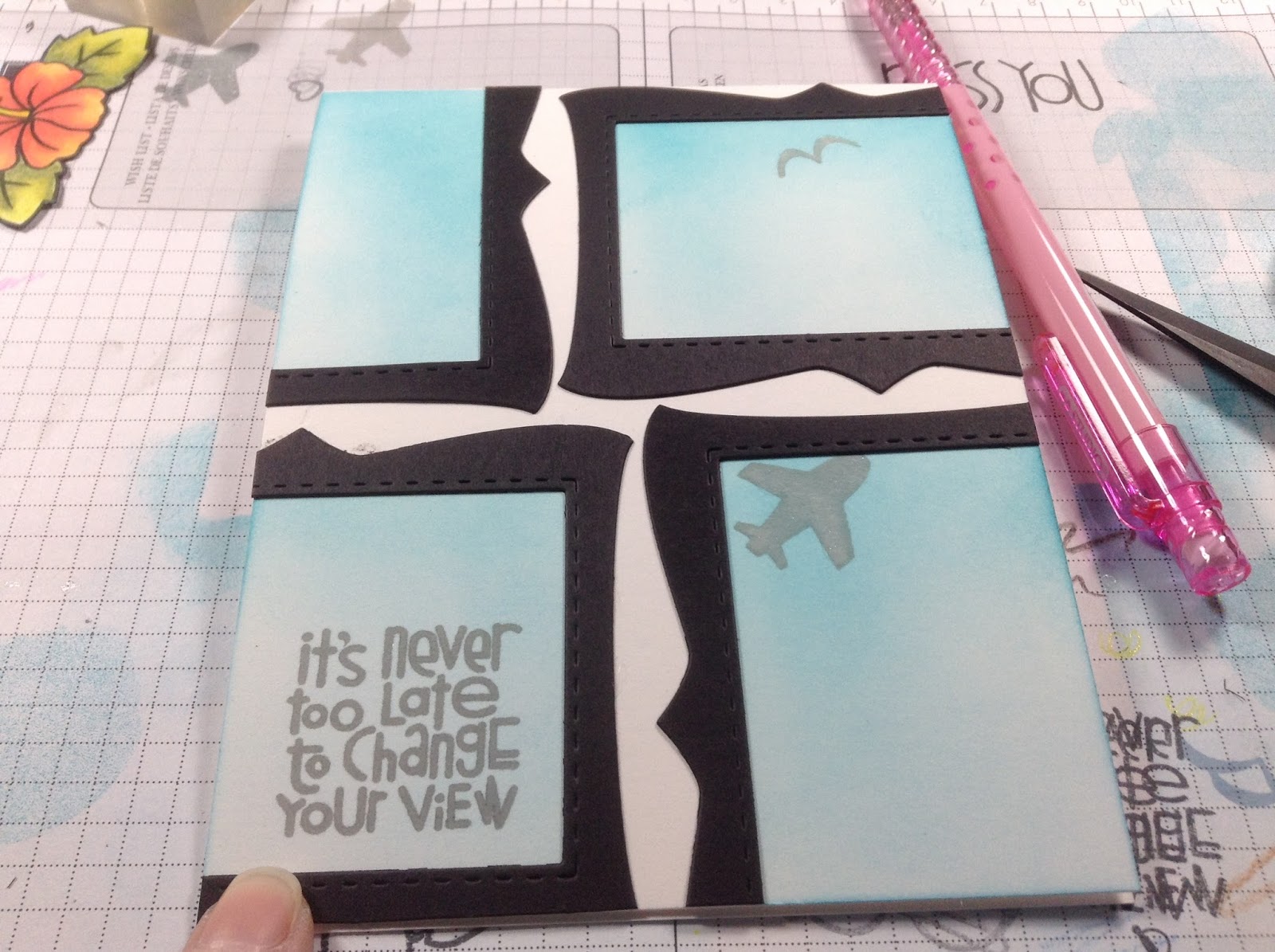 I erased all my pencil marks and started to assemble. I used Smoke Ink from Simon Says Stamp to stamp my sentiment and some additional small images. I adhered my frames using some Tombow Mono glue and my images with foam adhesive.