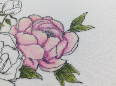 I chose a stamp set from The Ton Stamps called Happiest of Peonies.  It's a beautiful image.  I used my MISTI for the stamping because of the texture of the fabric.  I used Ranger Jet Black Archival Ink because I wasn't sure what medium I was going to use or rather, what medium was going to work!