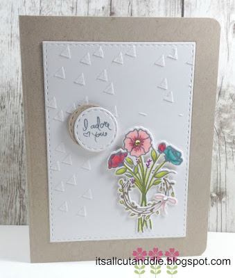 I stamped and die cut the bouquet image and coloured it with alcohol markers. I also stamped, coloured and die cut the small wreath and bow image. I placed everything in the bottom right corner of my white, embossed panel.